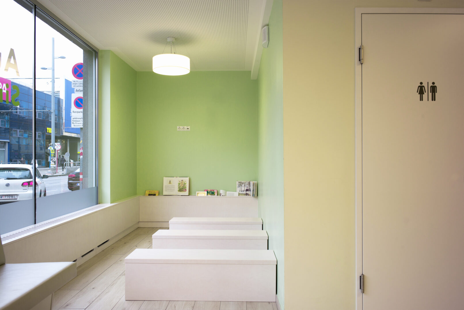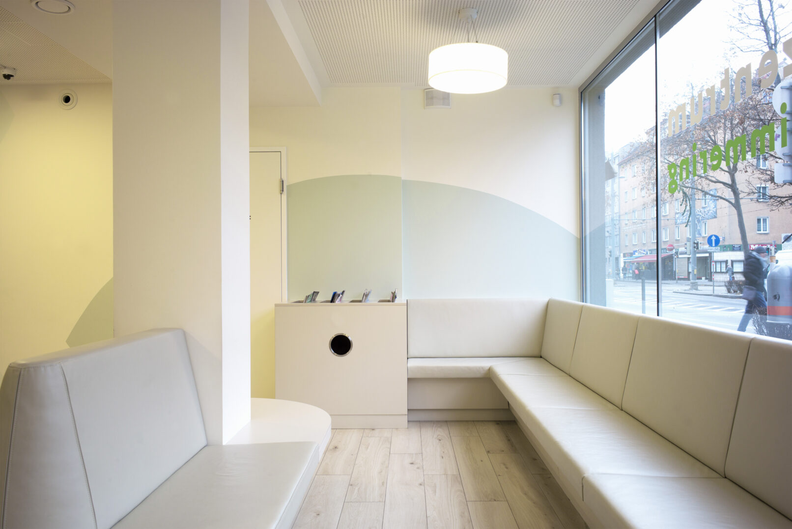 Die Orientierung wird den Patientinnen von den raumbildenden Elementen und einer diese begleitenden Wandgrafik erleichtert. Die Farb- und Materialwahl ist fein abgestimmt, es ergibt sich eine hochwertige und harmonische Atmosphäre. Die Ordination ist sowohl mit einer Lüftungs-