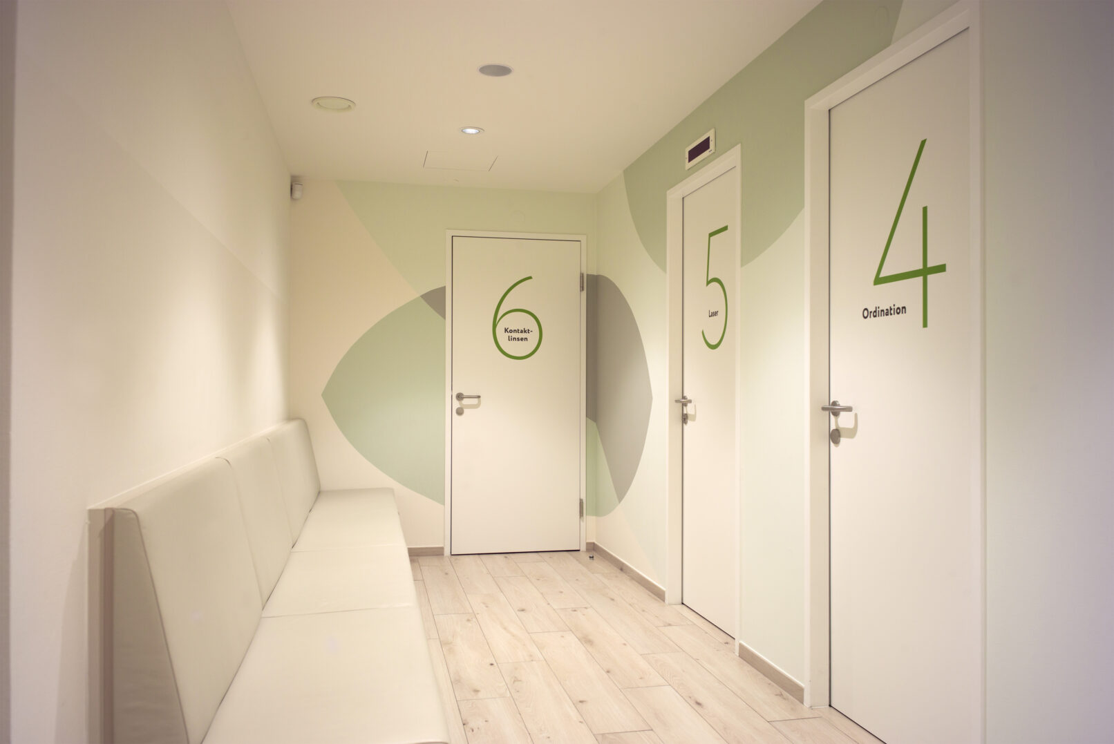 In einem intensiven Planungsprozess mit Dr. Soheil Yousef-Elahi ist eine moderne und weitläufige Augenarztpraxis mit 7 Behandlungsräumen und viel Freiraum für die Patientinnen entstanden. Zentrales Element ist die im Grundriss ovale Empfangstheke, die den Wartebereich mit den dahinter liegenden Behandlungsräumen verbindet.