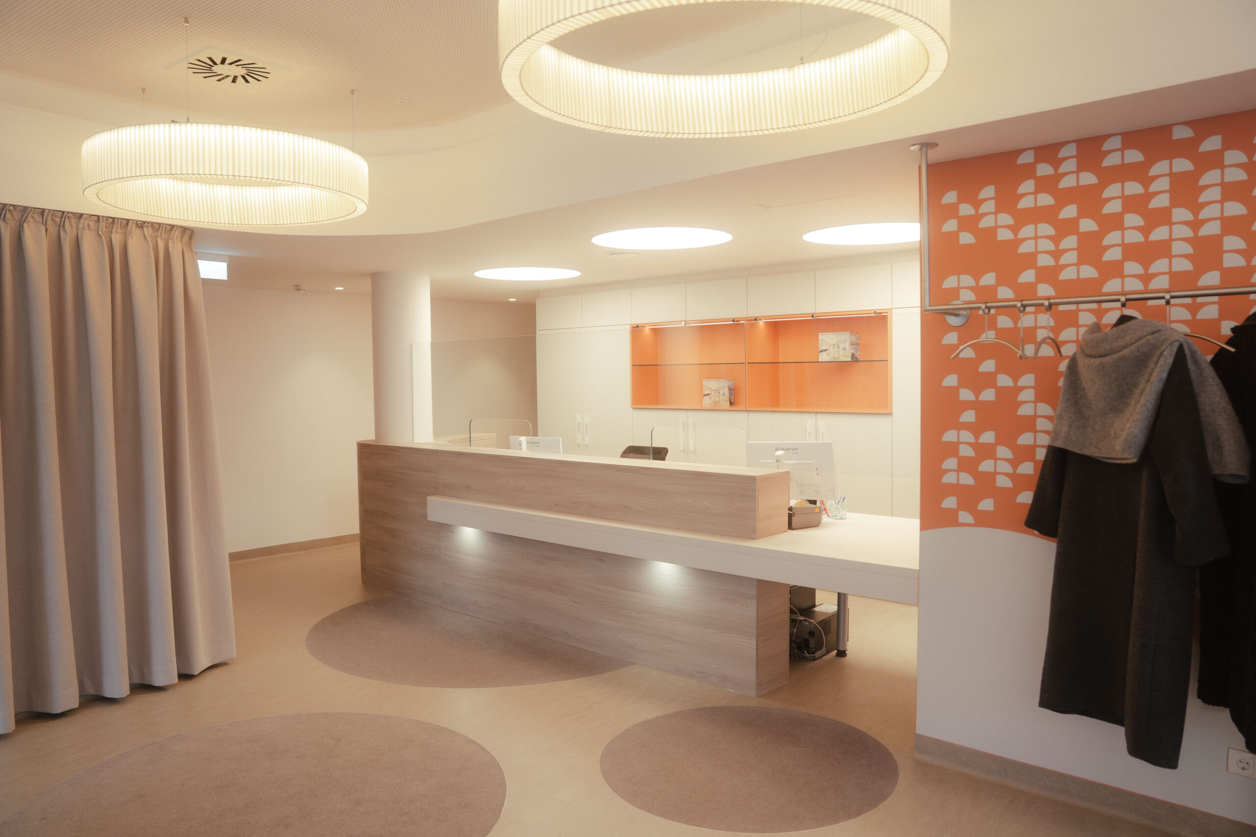 Die anregende wirkende Beleuchtung lässt die gesamte Inneneinrichtung und deren Farben und Materialien brillant erscheinen. Die hohe Aufenthaltsqualität in der Ordination von Dr. Rama, dem Floridsdorfer Frauenarzt, lässt einen reibungsfreien und erfolgreichen Praxisalltag erwarten.