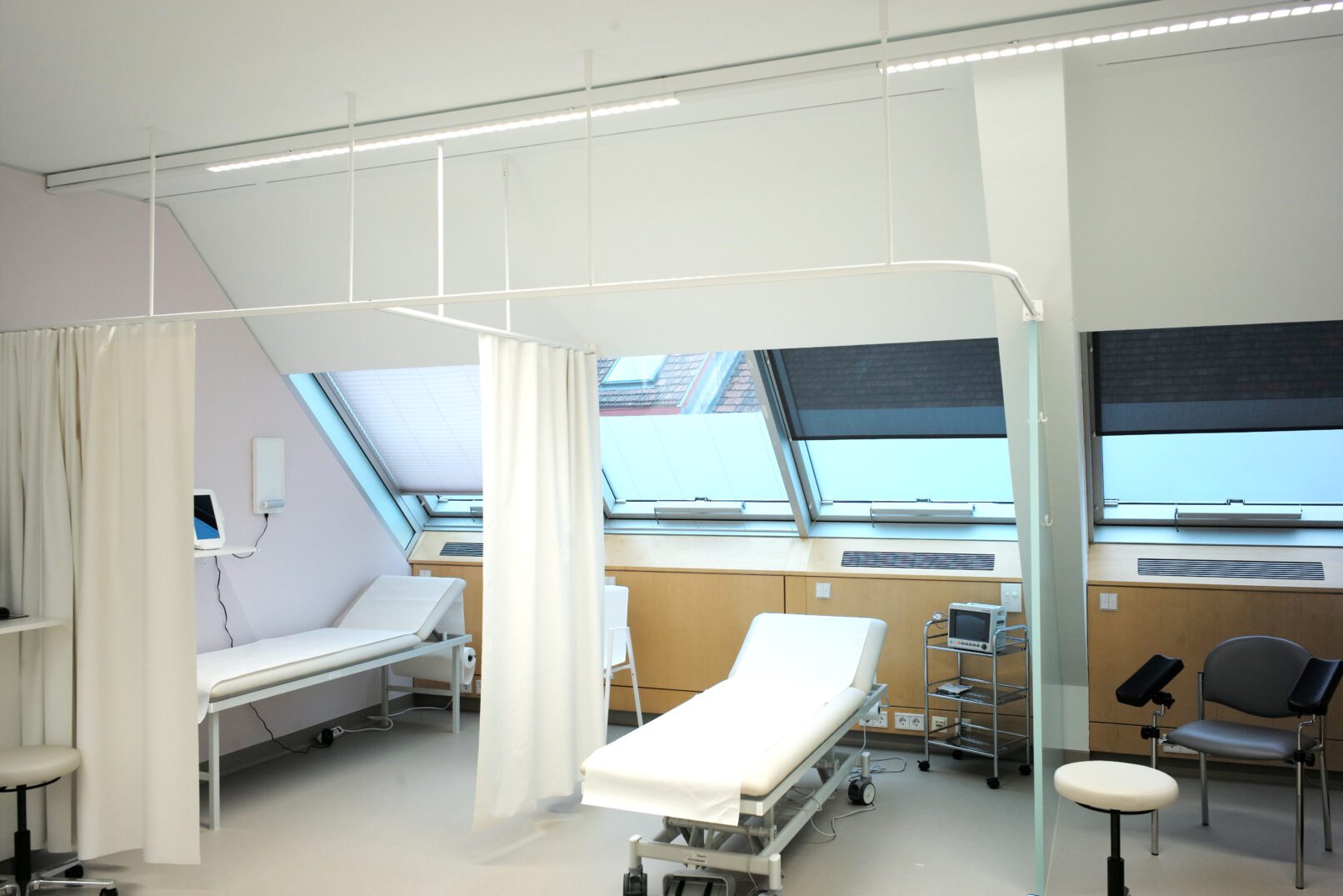 Sieben Ordinationsräume stehen jungen und erwachsenen Patienten zur Verfügung. In einem zentral gelegenen Untersuchungsraum werden alle Abklärungen vorgenommen. Labor, Infusionsbereich, EKG und Verbandswechsel sind hier zusammengefasst.