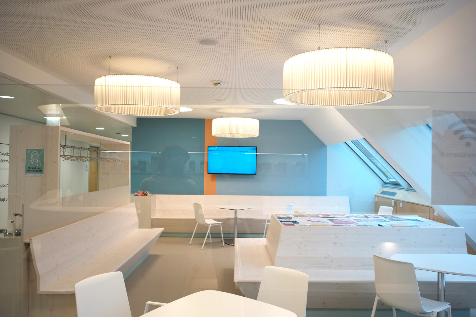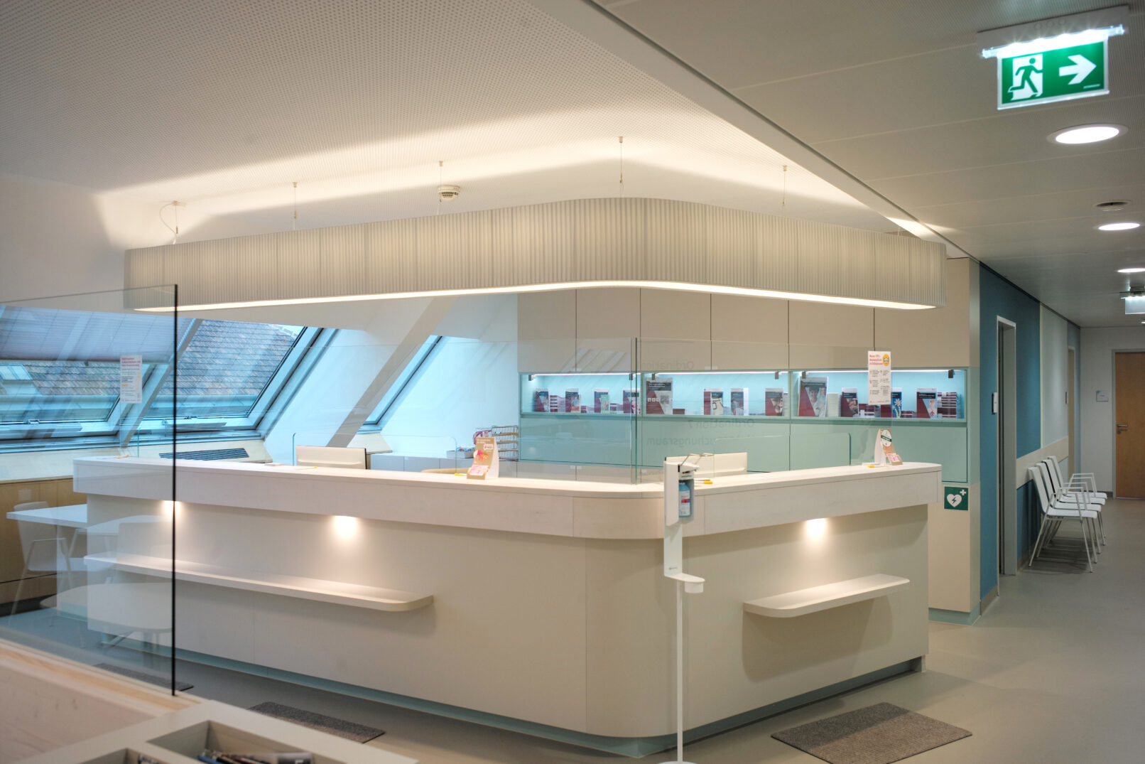 Zentral im Loft angeordnet sind Empfang und Wartebereich. Helles Holz und abgestimmte Farben lassen eine harmonische und freundliche Atmosphäre entstehen. Der Warteraum bietet Platz für 35 Patienten. Die Vollholzsitzbänke sind ergonomisch optimiert. Die Beleuchtung mit plissierten Lampenschirmen fügt sich elegant in das Raumkonzept ein.