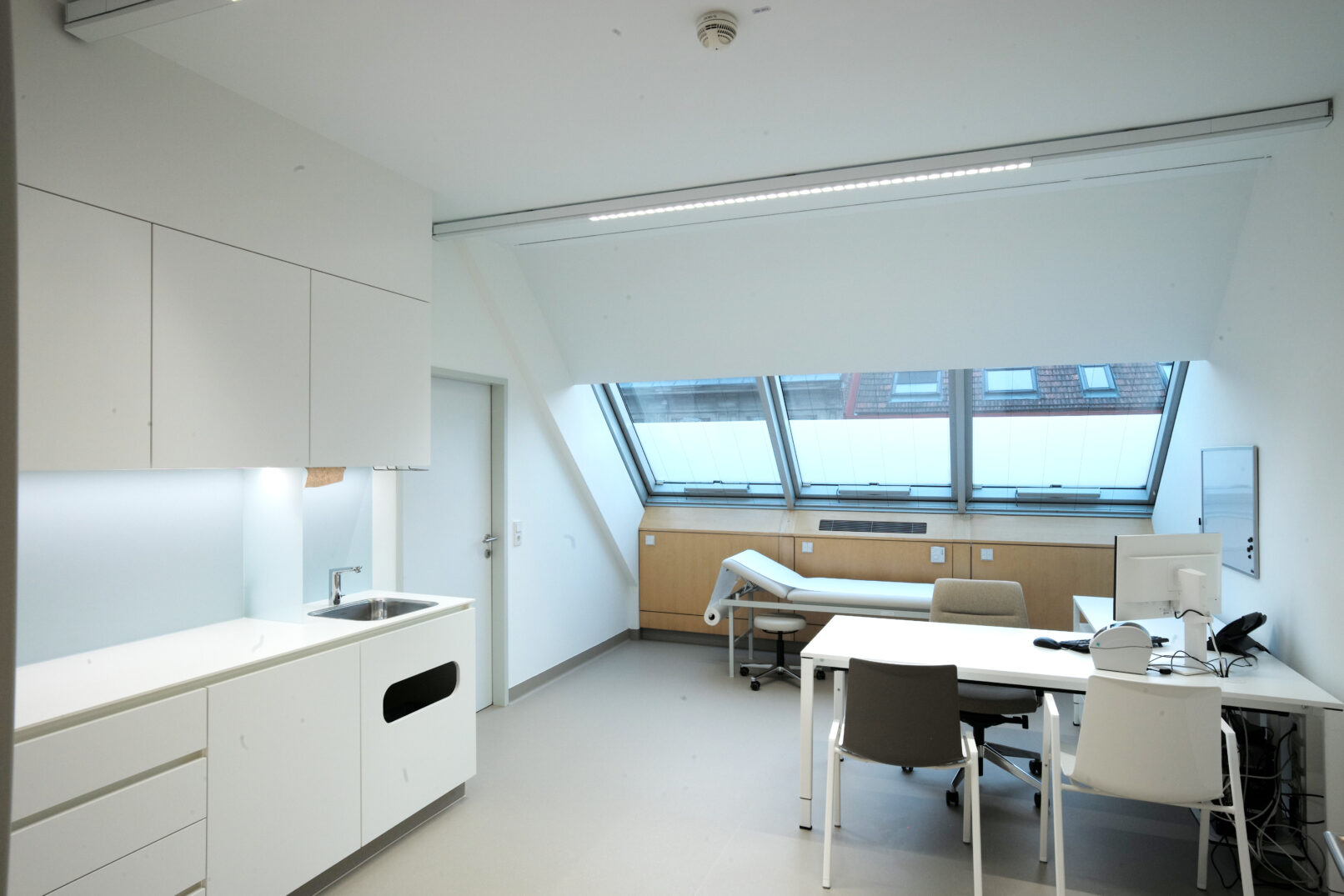 Sieben Ordinationsräume stehen jungen und erwachsenen Patienten zur Verfügung. In einem zentral gelegenen Untersuchungsraum werden alle Abklärungen vorgenommen. Labor, Infusionsbereich, EKG und Verbandswechsel sind hier zusammengefasst.