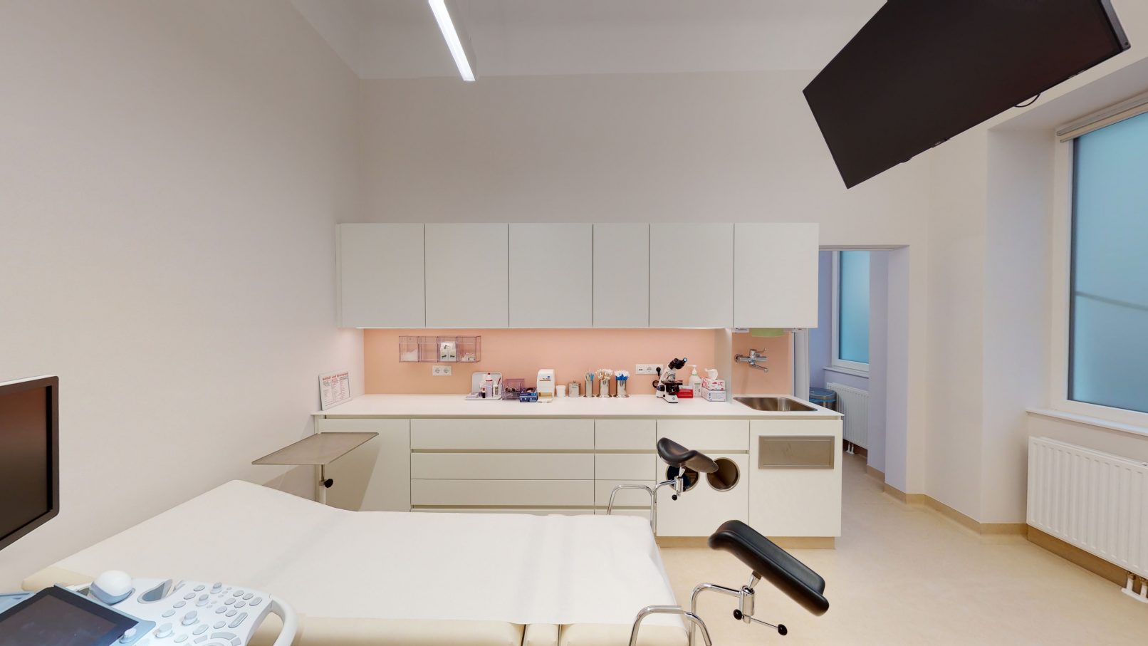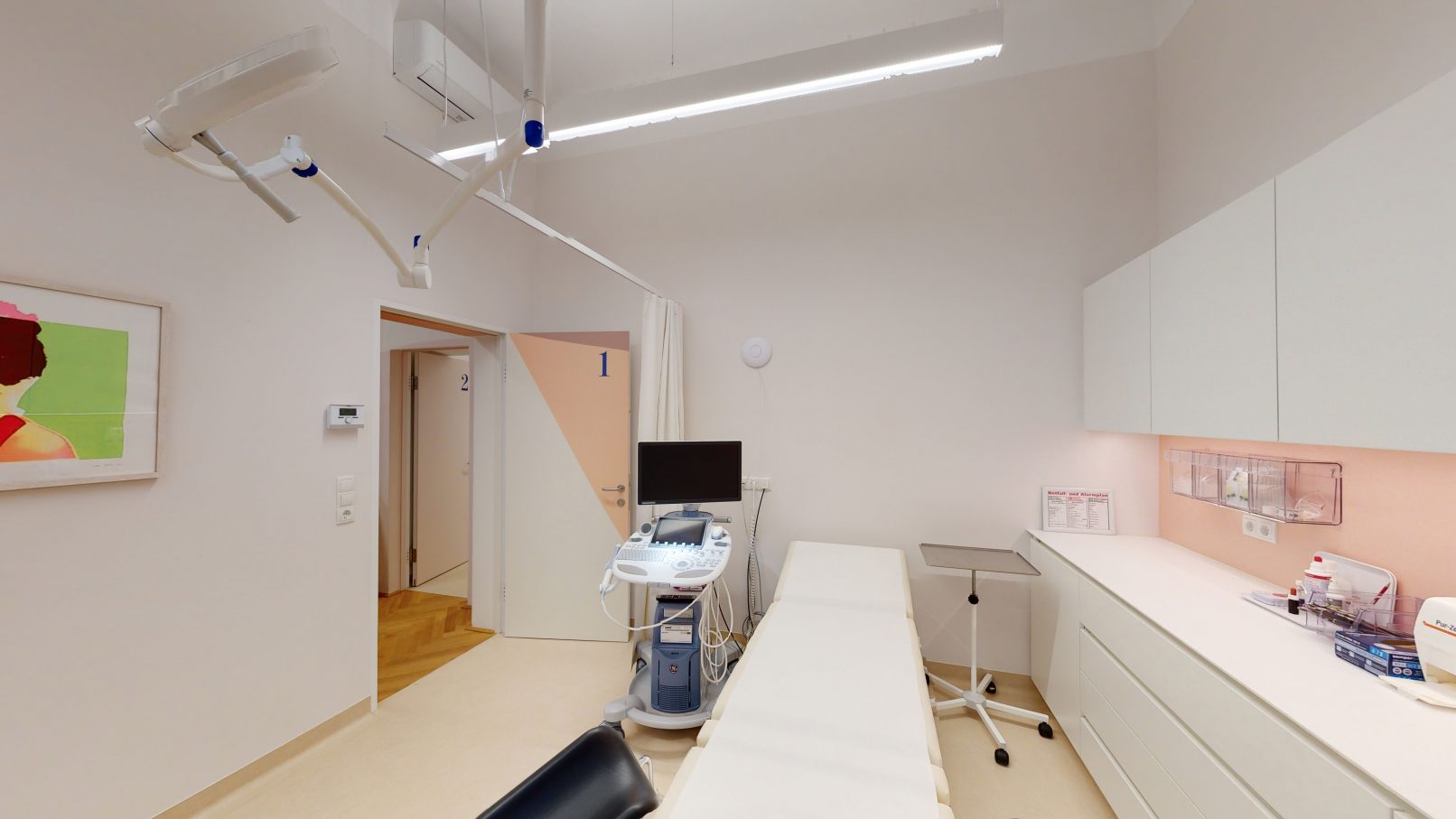 In den Behandlungsräumen wurde auf eine funktionelle Möblierung Wert gelegt. Zart changierende Wandfarben ergänzen die Gestaltung und verleihen den Räumen Harmonie.